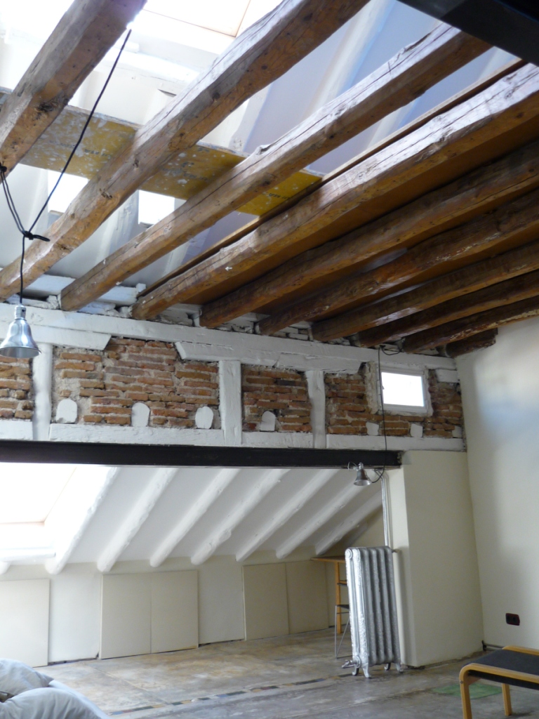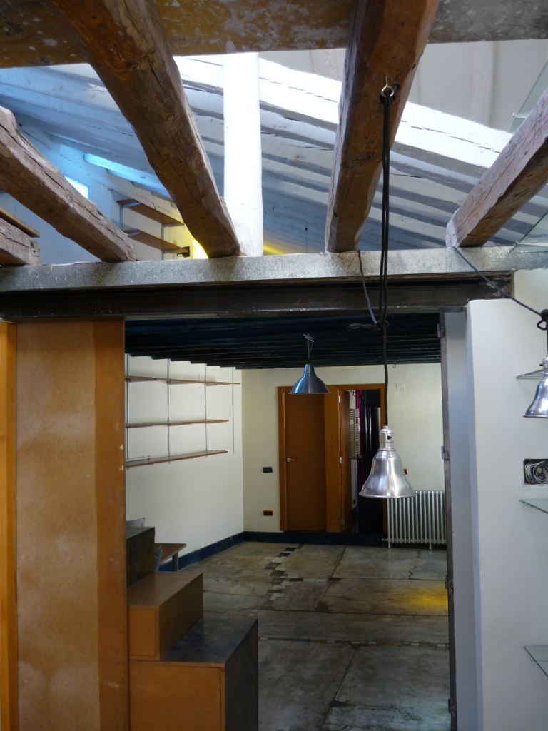 En el caso de la Tienda Xela, antes había sido una oficina bancaria. Su magnífica fachada de 80cm de bloques de granito y ladrillo de tejar estaba tabicada y enlucida;, los mechinales que conforma, en desuso; su altura, bajada a lo que dejaban los huecos sin más. La labor fue un puro desnudar, y añadir poco.